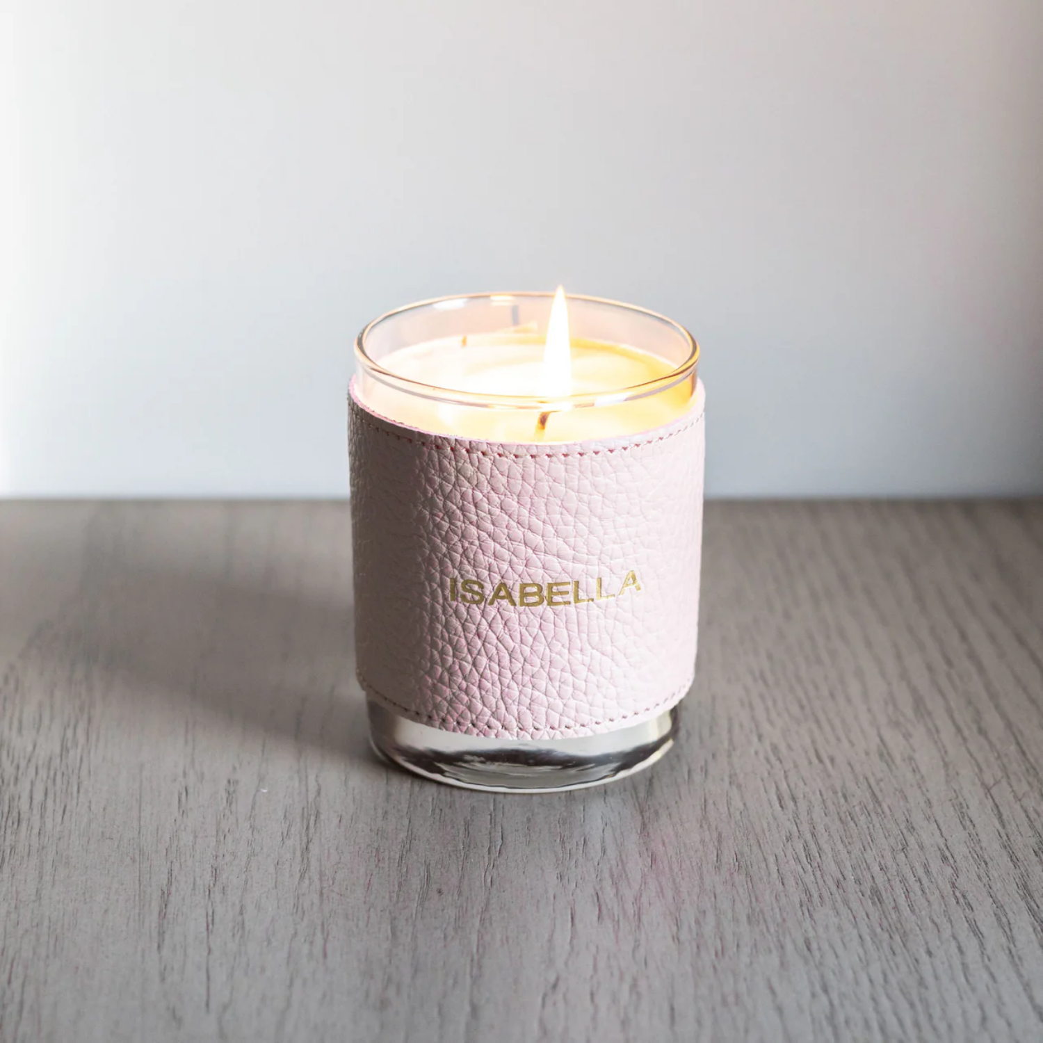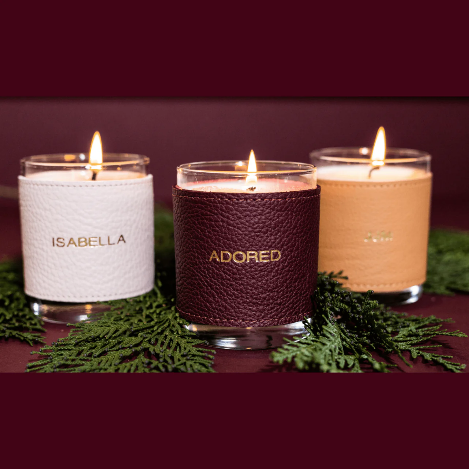 A beautiful, leather wrapped candle that can be customized. 2 scents, 3 colors, and endless monogram + personalization options