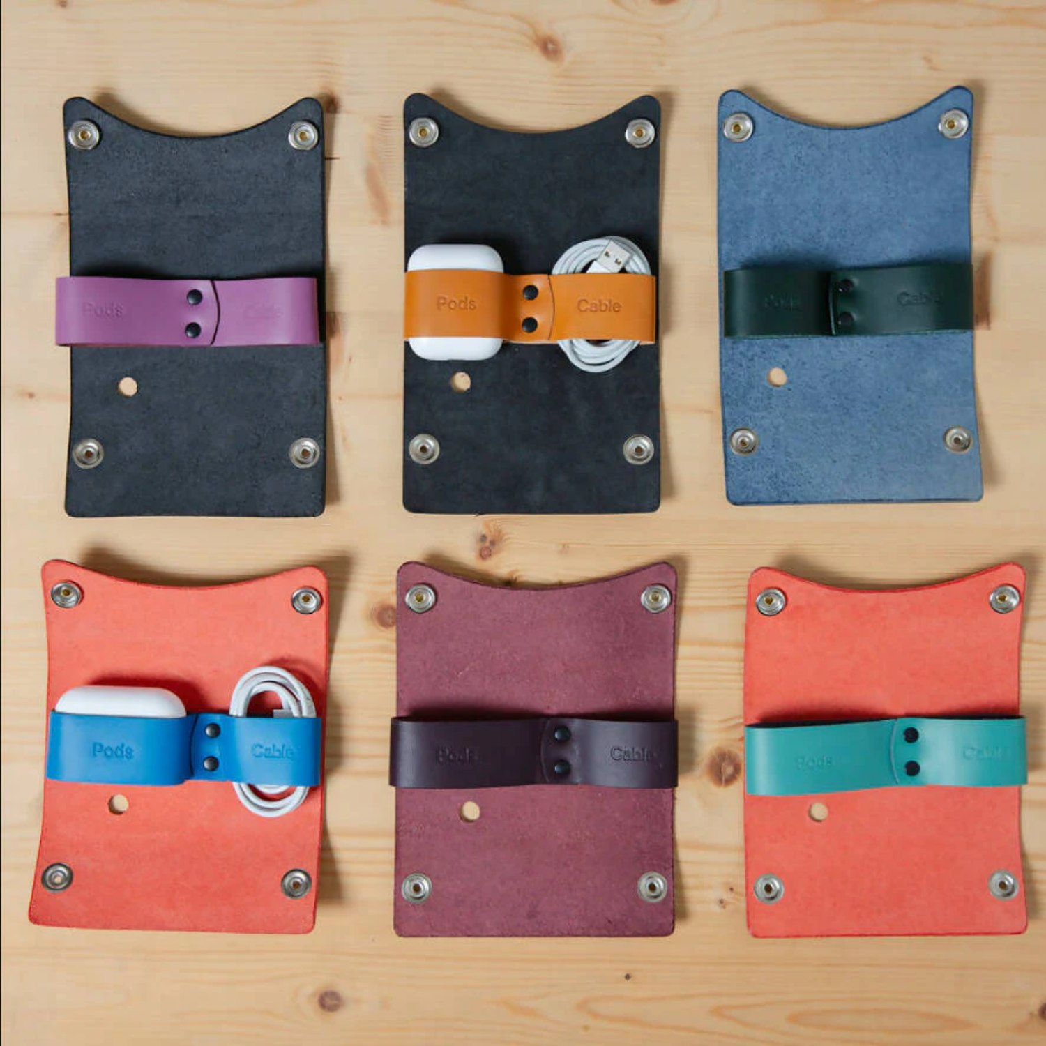 This small leather carrying case holds the AirPods and the charging cable too. There is a neat little hole through the leather which enable the Air Pods to be charged.