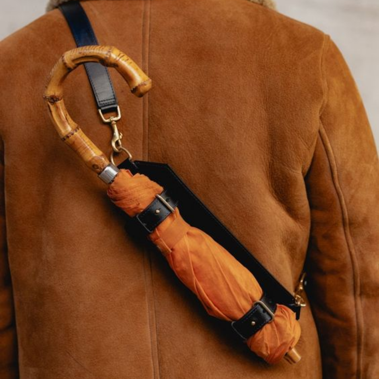 Elevate your rainy-day ensemble with the Original Umbrella Sling. Made from reinforced, veg-tan leather, it shows off elegance and effortless functionality. With adjustable straps to attach various different-sized umbrellas and an all-leather cross-body strap, this versatile accessory promises to be your new wet weather essential. Made with solid brass hardware as standard and treated with Goldtop waterproofing balm, they are built to last.