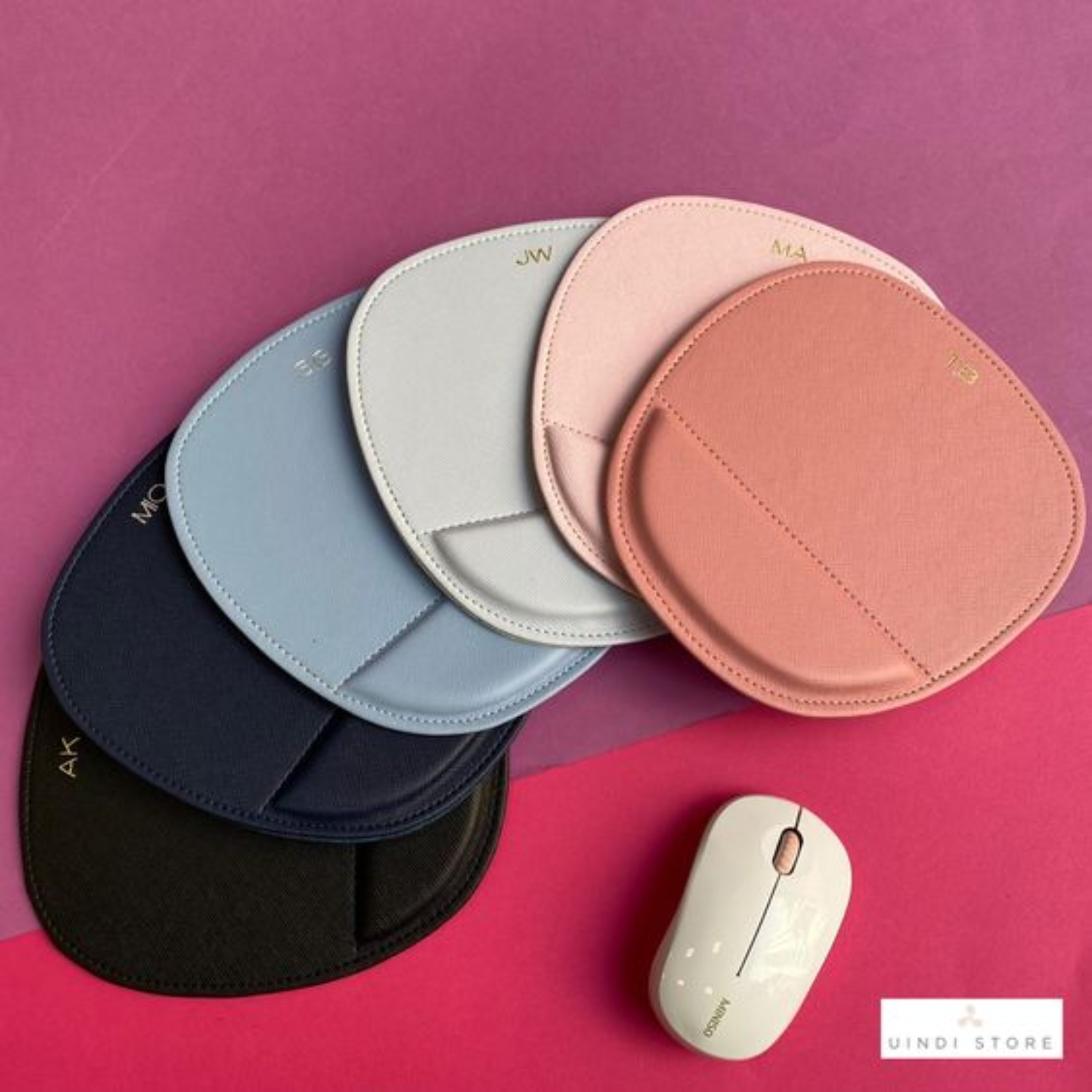 The mouse pad is made of synthetic material, has an oval shape with wrist support, personalized with hot stamping, and features stitched finishing.