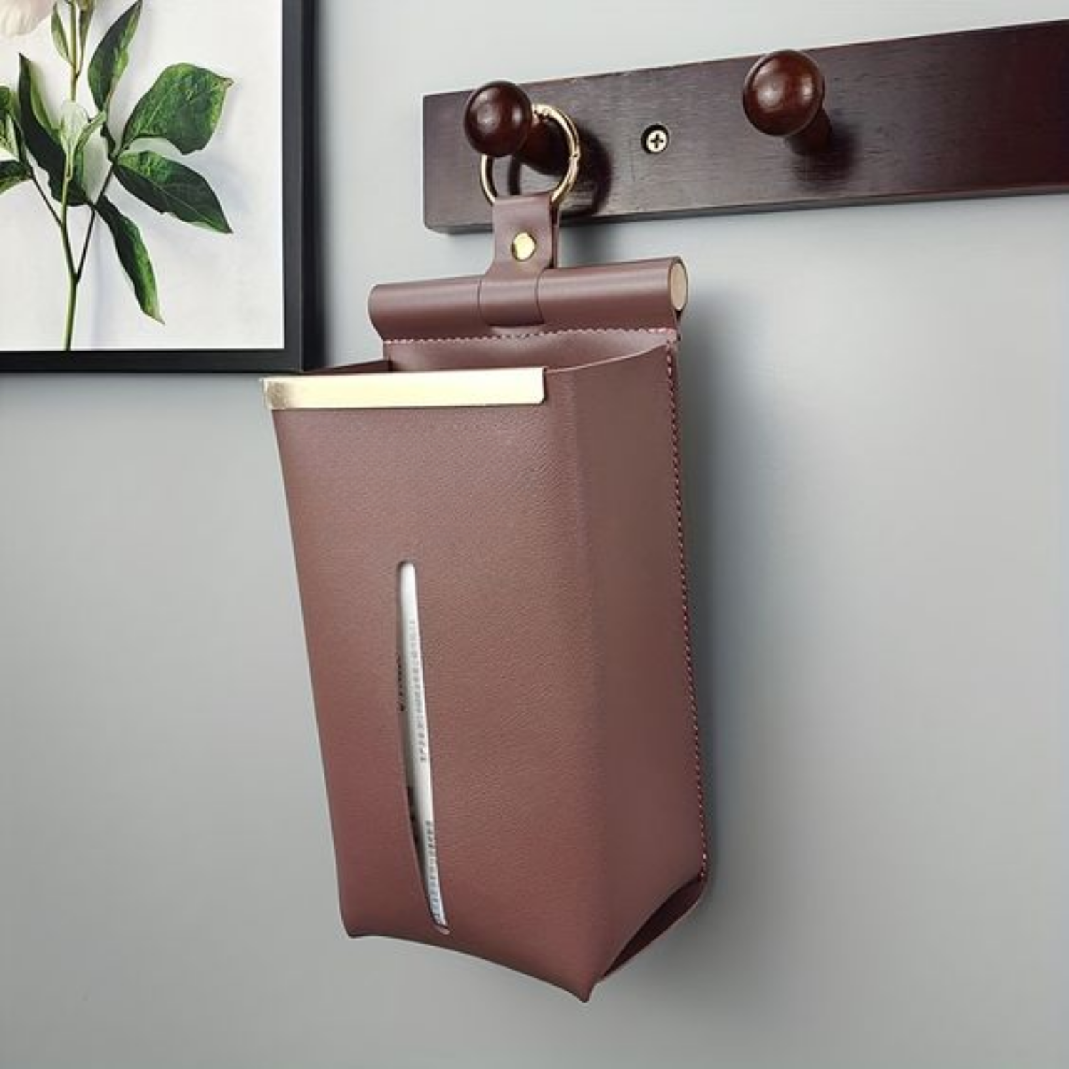 Leather tissue box is a small accessory designed to conveniently store and dispense tissues while you're on the go. It is a compact container that can be easily attached to your car's seatback. The holder is specifically designed to keep your tissues within reach, making it convenient for quick cleanups, wiping hands, or dealing with unexpected spills or allergies while driving.